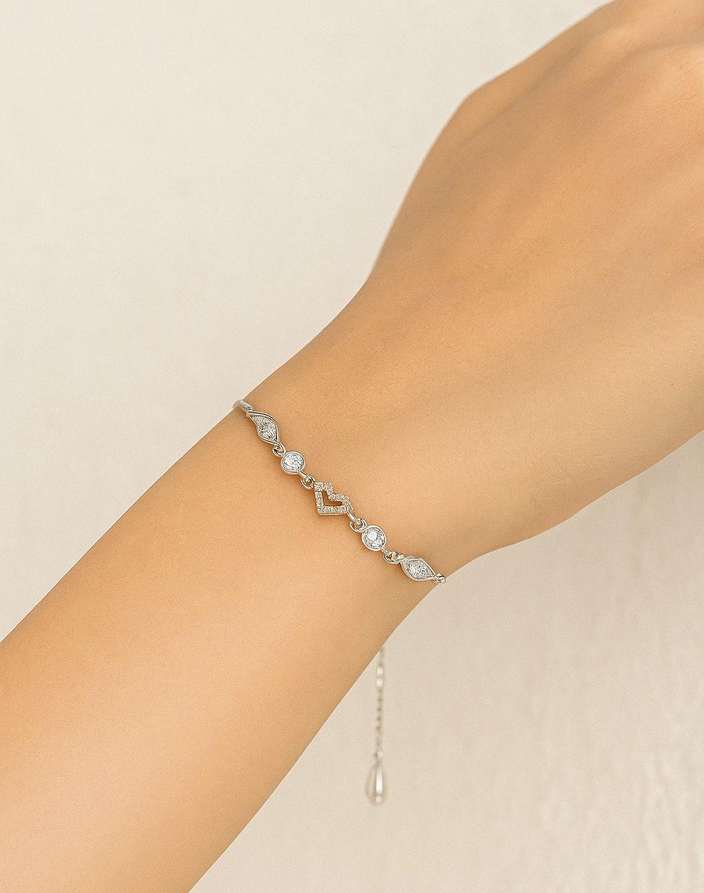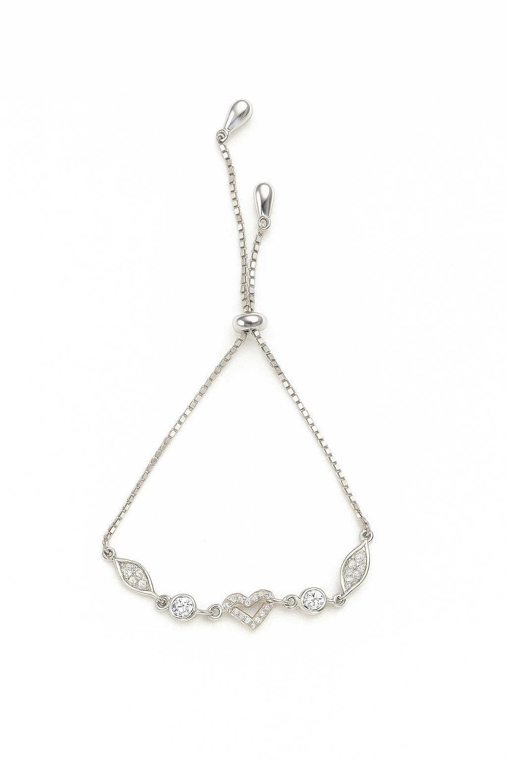 Delicate yet striking, the Dazzle Heart Silver Bracelet is a true symbol of elegance. This adjustable bracelet features a graceful heart centerpiece surrounded by glistening cubic zirconia stones and intricately designed marquise motifs. Crafted in premium 925 sterling silver, it offers a radiant finish that complements both casual and formal attire. Its adjustable chain ensures a comfortable fit for every wrist, making it a thoughtful gift or a timeless addition to your personal collection.