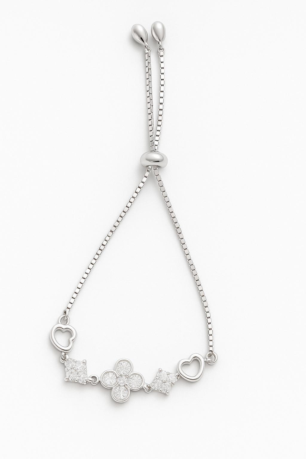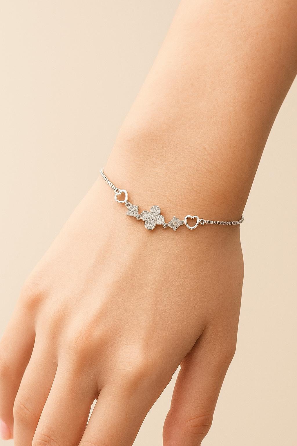 Add a touch of elegance and charm to your wrist with the Radiant Heart & Bloom Adjustable Bracelet. Expertly crafted in high-polish sterling silver, this delicate bracelet features a stunning centerpiece made of brilliant-cut cubic zirconia stones arranged in a floral bloom. Flanked by sparkling square elements and open-heart charms, its feminine design symbolizes love, beauty, and grace.