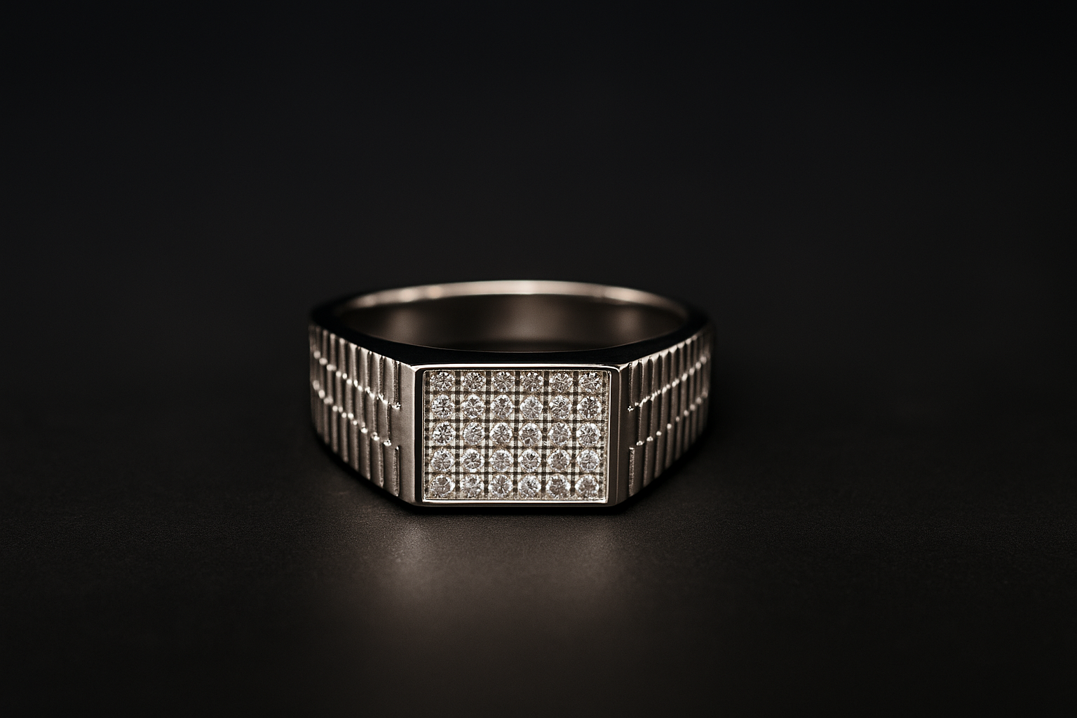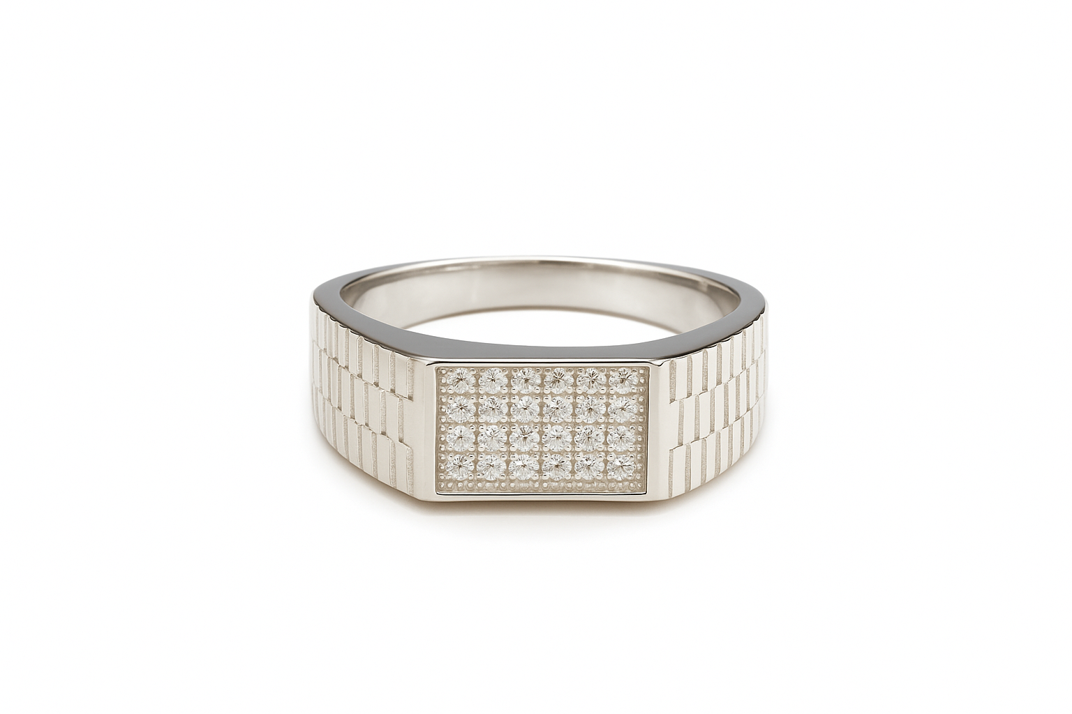 Command attention with this bold men’s ring crafted in sterling silver. Its square face is set with dazzling pave diamonds arranged in a sleek grid, while the modern band design adds a touch of contemporary class. Perfect for daily wear or special occasions — a timeless symbol of style and success.