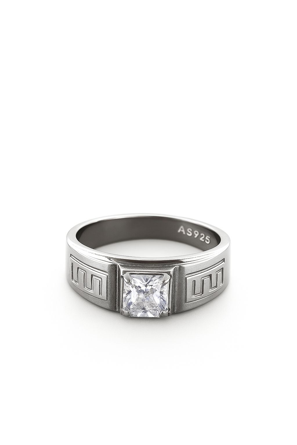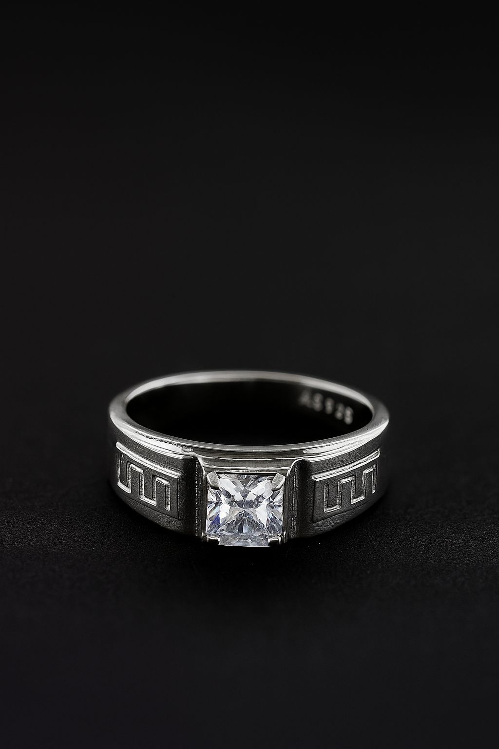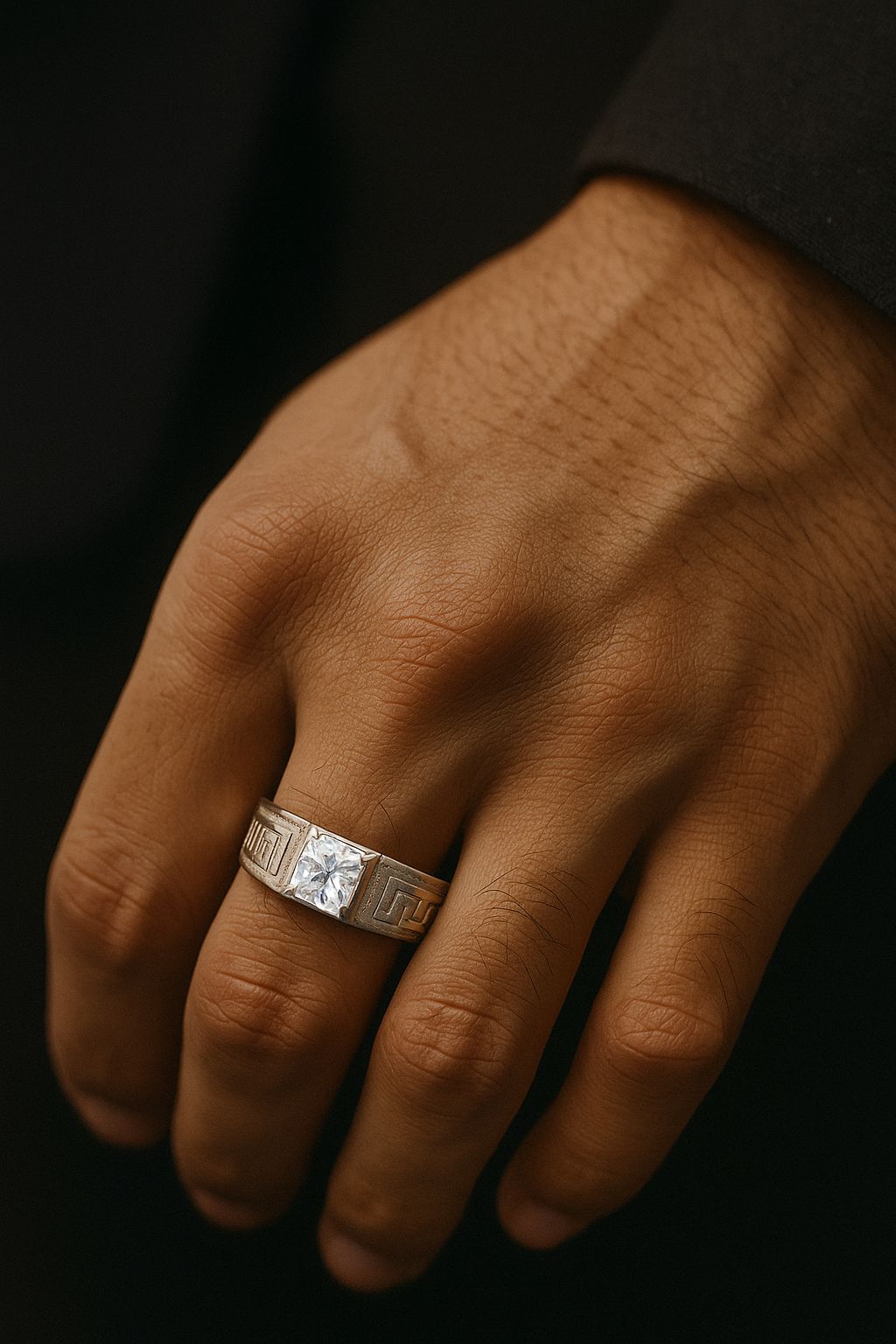 Crafted in premium 925 sterling silver, this bold men’s ring features a striking princess-cut cubic zirconia stone set at the center, symbolizing strength and elegance. The band is detailed with an intricate Greek key design, adding a timeless touch of sophistication. Perfect for both everyday wear and special occasions, this ring combines durability with a refined modern style, making it a statement piece for the confident gentleman.