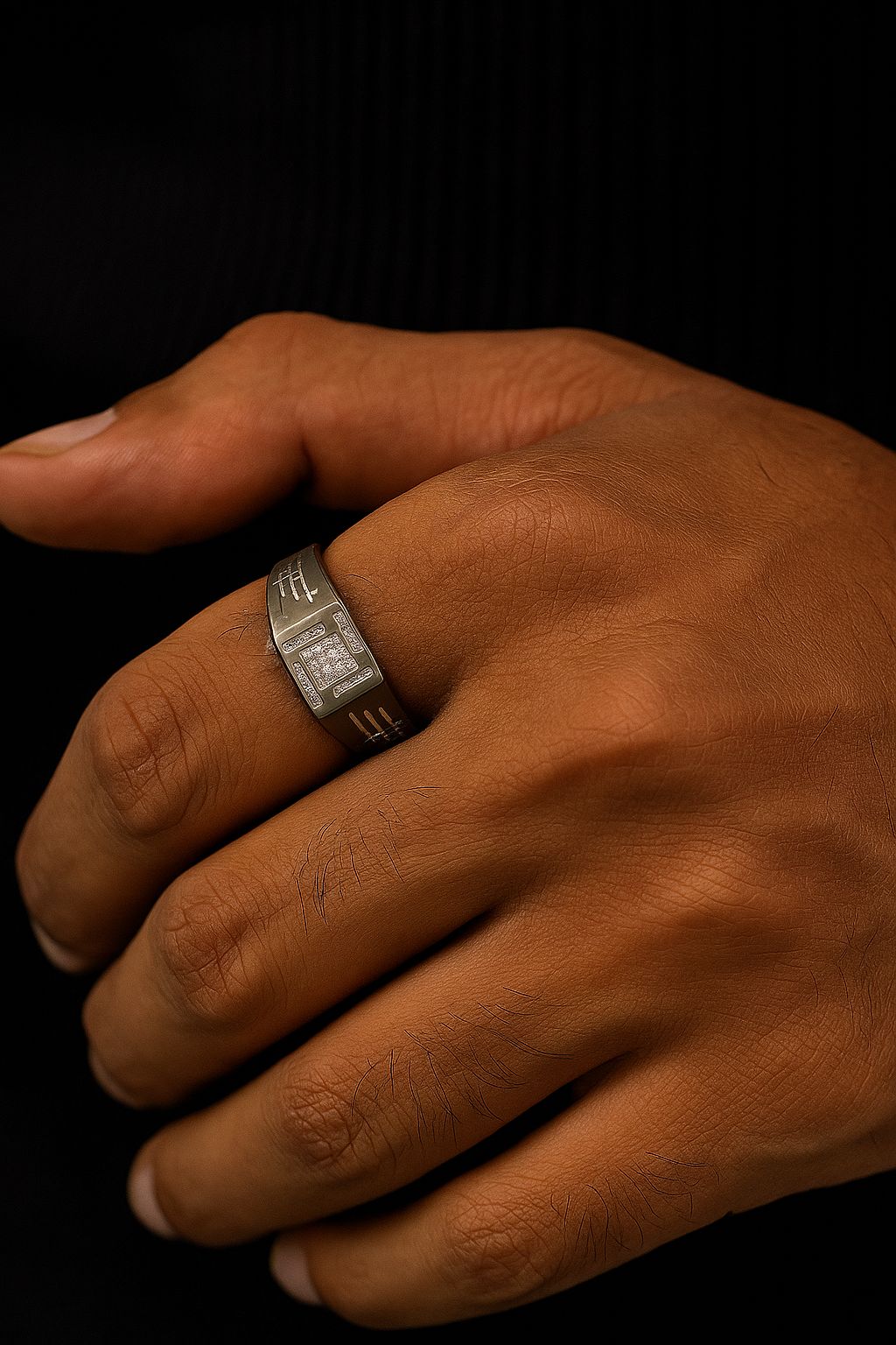 Make a bold statement with our Sterling Silver Square Pattern Men’s Ring, crafted to perfection for modern men who value elegance and individuality. The ring features a sleek rectangular face adorned with a grid of sparkling cubic zirconia stones, complemented by engraved geometric detailing on the band.